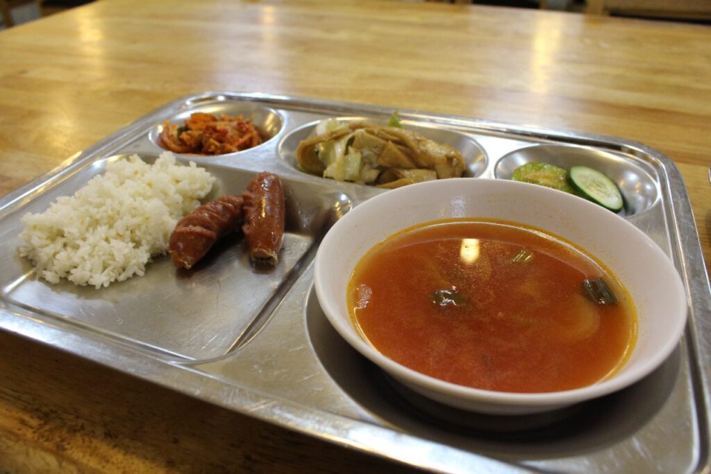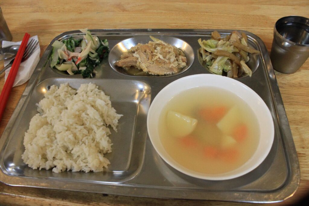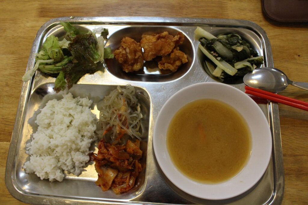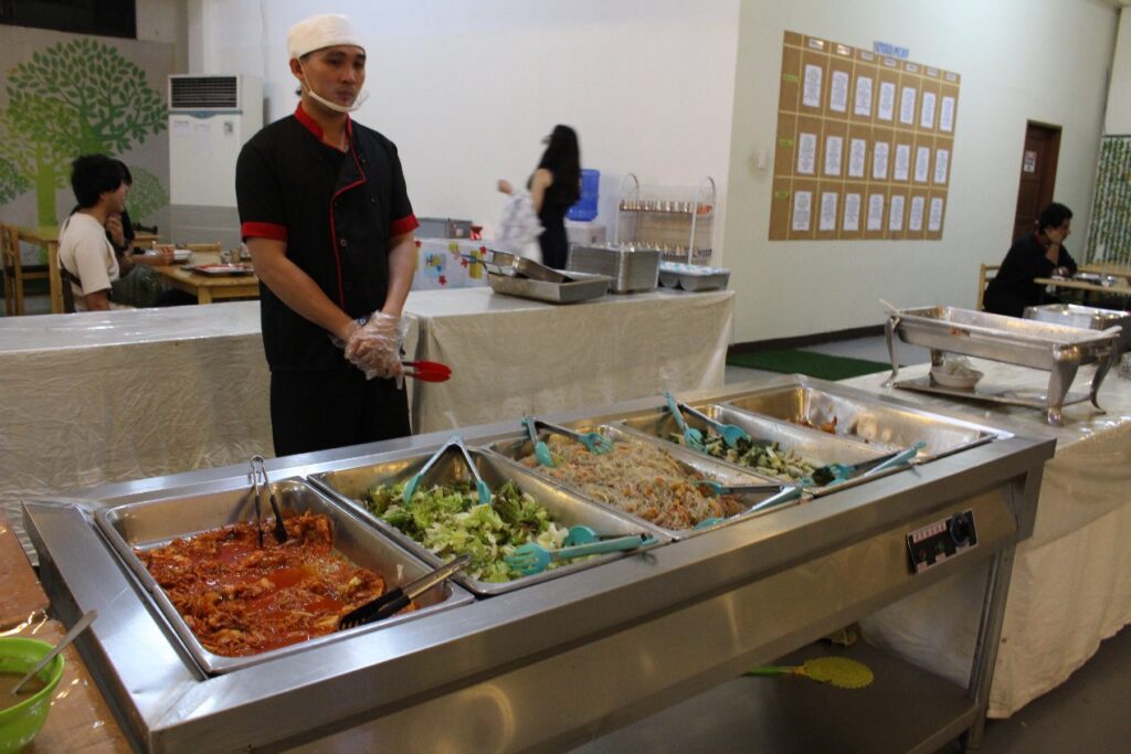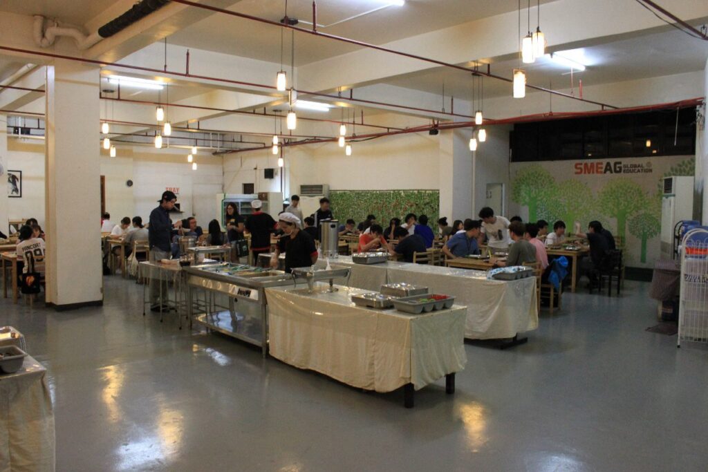 食堂では朝、昼、晩ビュッフェ形式で食事が提供されており、メニューはその時の国籍率により変化します。例えば日本人学生が多い時は日本料理が増え、韓国人学生が多い時は韓国料理の割合が増えます。他にも中華や洋食など様々なメニューが登場します。
