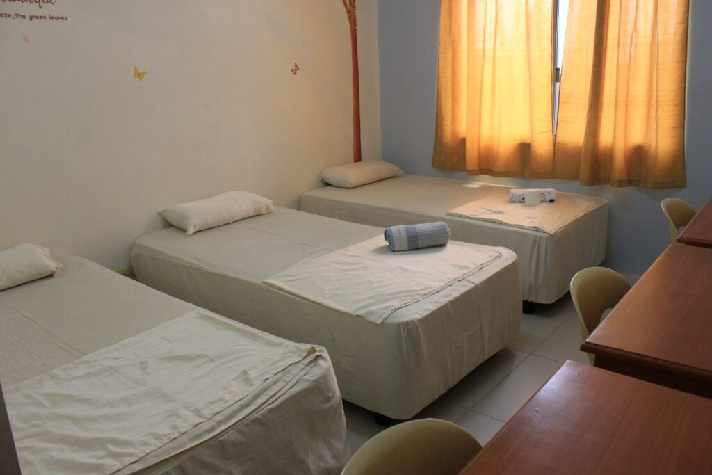 今回はこちらの3人部屋に滞在させていただきました。人数分の机があり、お部屋でもしっかり勉強できますよ!お部屋にはベッド、机、クローゼット、冷蔵庫、キッチンスペースがあります。
